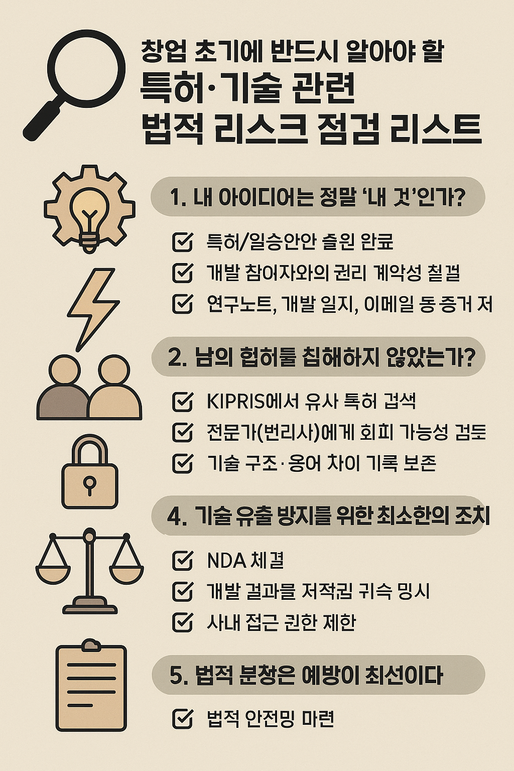 창업, 아이디어만으론 부족하다“좋은 아이디어 하나면 창업 성공!”많이들 이렇게 말하지만, 실제 현장은 다릅니다.아이디어보다 더 중요한 건 법적 리스크 관리입니다.특히 특허, 상표, 기술유출, 지식재산권 분쟁은창업자의 무지 하나로도 치명타를 줄 수 있습니다.1. 내 아이디어는 정말 ‘내 것’인가?많은 예비 창업자들이 ‘내가 생각했으니까 내 거지’라고 생각하지만,생각만으로는 권리가 생기지 않습니다.반드시 특허 또는 실용신안 출원을 해야 ‘법적 보호’가 시작됩니다.‘아이디어 제공서’나 ‘이메일 증거’만으로는 소송 시 인정받기 어렵습니다.공동 개발 시에는 지분·기여율·권리 귀속 계약서를 반드시 작성해야 합니다.체크 포인트특허/실용신안 출원 완료개발 참여자와의 권리 계약 체결연구노트, 개발 일지, 이메일 등 증거..